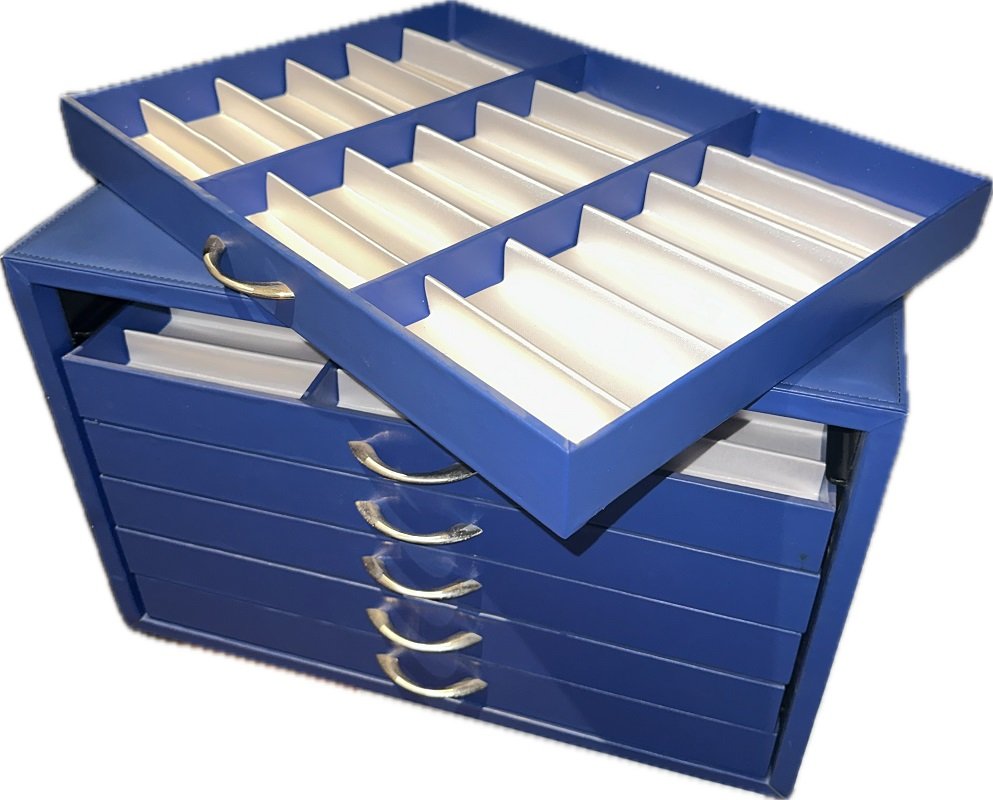 Mueble compacto ideal para ópticas que necesitan una solución práctica y estilizada para organizar su stock. Con un diseño en color azul, este modelo cuenta con 6 bandejas extraíbles de 5 cm de altura, permitiendo el almacenamiento ordenado de hasta 108 gafas de receta o de sol.