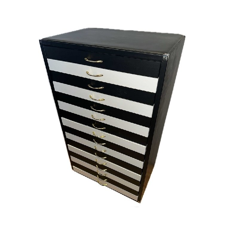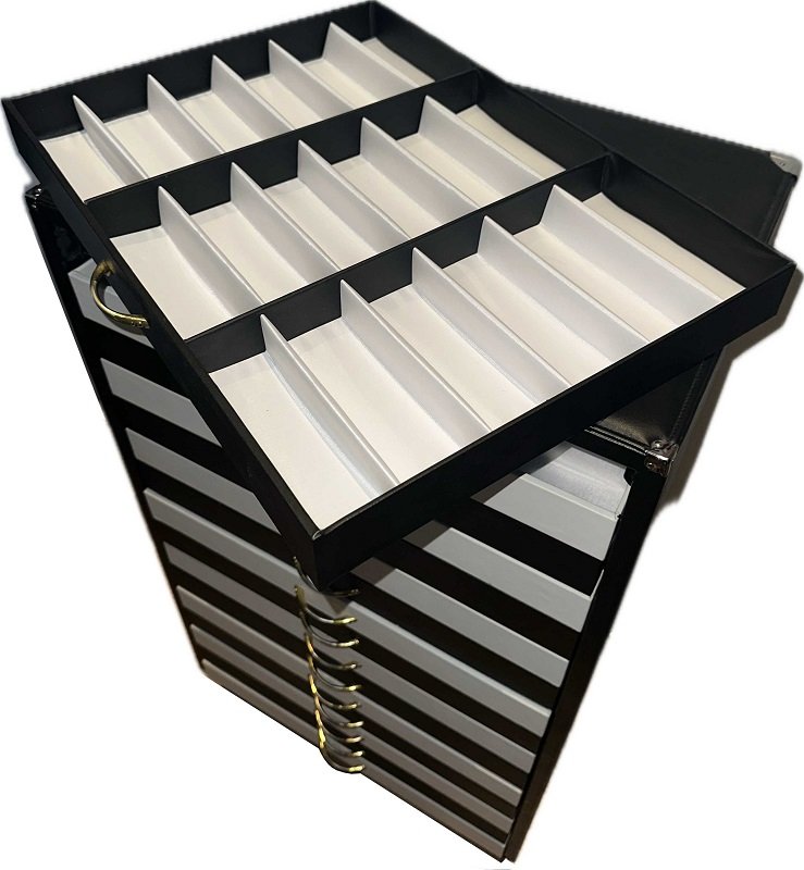 Mueble organizador especialmente diseñado para ópticas, con terminación bicolor en blanco y negro que aporta un estilo moderno y llamativo. Cuenta con 16 bandejas extraíbles de 5 cm de altura, ideales para el almacenamiento ordenado y cómodo de gafas de receta o de sol.