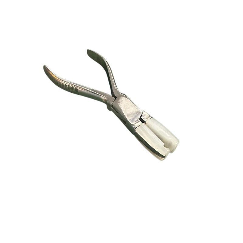 Pinza profesional para óptica equipada con terminales de plástico con hendidura, diseñada para mejorar el agarre sobre la montura sin dejar marcas. Ideal para ajustes seguros en gafas delicadas, brindando mayor control y estabilidad durante la manipulación.