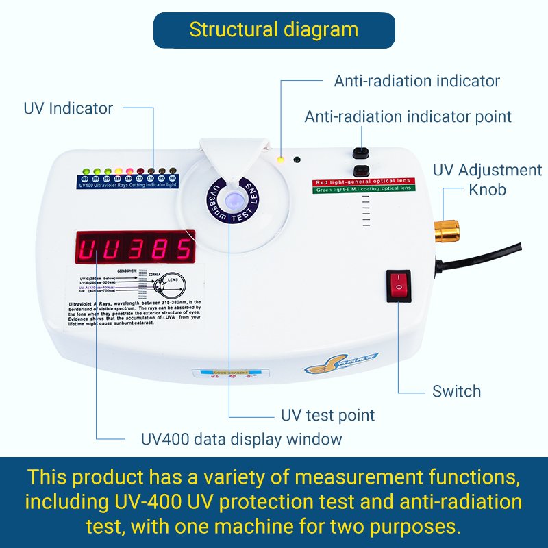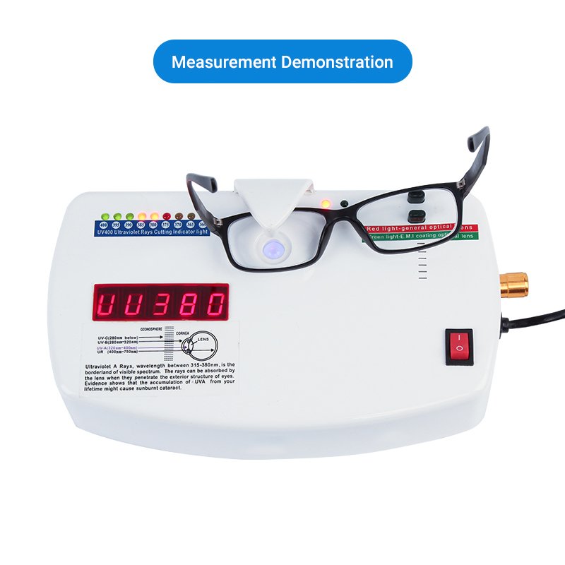 Este dispositivo permite una medición rápida y confiable de la capacidad de filtrado UV de las lentes, así como una prueba adicional de protección contra radiación.